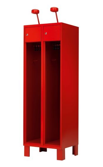 Feuerwehrschrank ohne Türen mit Wertfach und Kugelkalotte : - Feuerwehrschrank auf Füßen - Helmhalter aus Stahlrohr und einer allseitig geschlossenen Kugelkalotte auf dem Dach jedes Abteils, so dass ein Verhaken der Helmbelederung ausgeschlossen ist - glatter Schrankboden - je Abteil mit verschließbaren Wertfach (serienmäßig mit Sicherheits- Zylinderschloß inkl. 2 Schlüsseln) - mit 4 Stahlblech-Füßen - Farbe: Feuerrot RAL 3000 Abb. ähnlich!